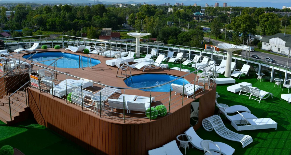 Можно в Хабаровске найти и бассейн на крыше дома, например, в ТЦ «Юбилейный» на улице Шкотова. Здесь есть и джакузи, бесплатные шезлонги, игровая площадка. Стоимость посещения 700 рублей, детям до 5 лет бесплатно. Режим работы также с 10 до 20 часов.