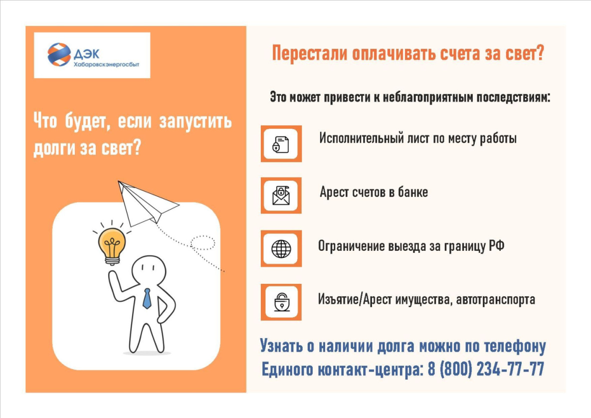 «Хабаровскэнергосбыт» (филиал ПАО «ДЭК») призывает клиентов компании оплатить долги за электрическую и тепловую энергию.
