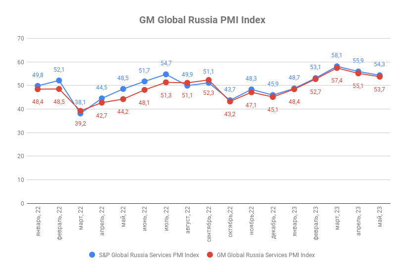 Майское значение индекса деловой активности ГлобалМедиа PMI (GM Global Services Russia PMI Index) составило 53,7 п.п. против 55,1 п.п. в апреле. Значение индекса деловой активности в сфере услуг от S&P Global (Global Russia Services PMI by the S&P Global) за аналогичный период снизилось с 55,9 п.п. до 54,3 п.п.