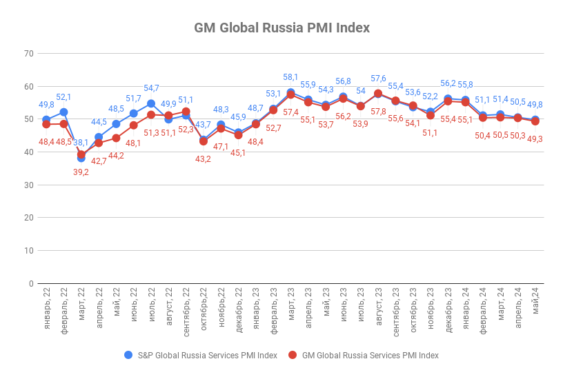 Майское значение индекса деловой активности ГлобалМедиа PMI (GM Global Services Russia PMI Index) составило 49,3 п.п. против 50,3 п.п. в апреле. Значение индекса деловой активности в сфере услуг от S&P Global (Global Russia Services PMI by the S&P Global) за аналогичный период снизилось с 50,5 п.п. до 49,8 п.п.