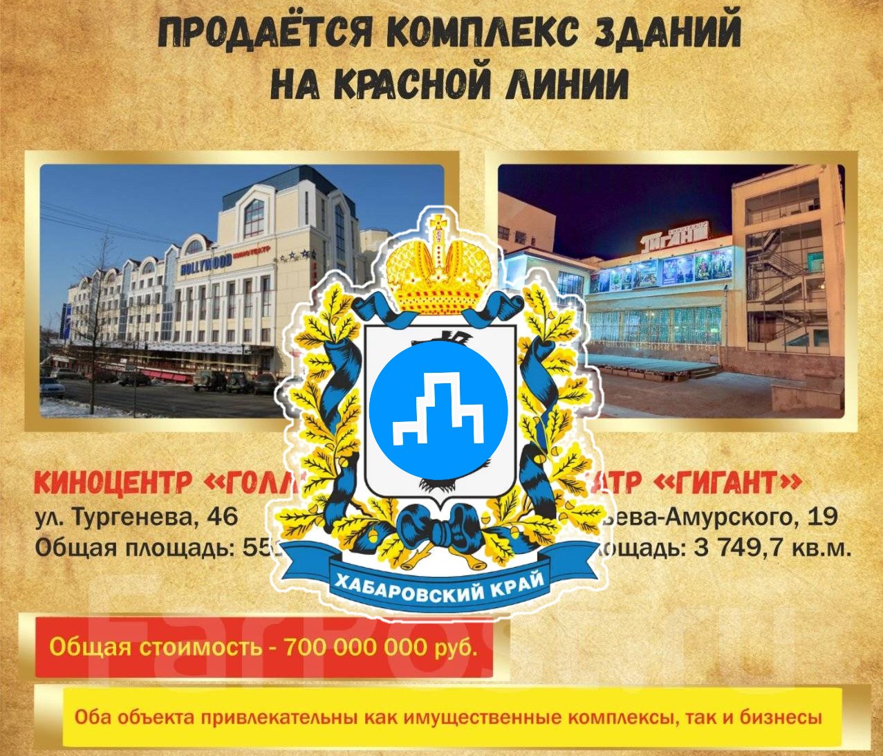 В Сети появилось объявление о продаже зданий на красной линии: кинотеатр «Гигант» на Муравьёва-Амурского и киноцентр «Голливуд» на Тургенева, 46. Общая стоимость сооружений - 700 миллионов рублей, сообщает Khabara.ru .