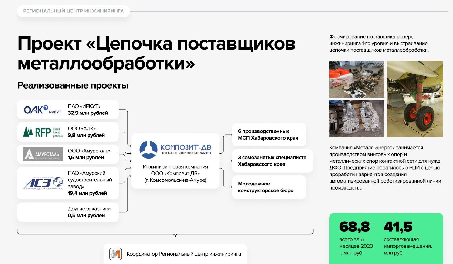 Региональный центр инжиниринга Хабаровского края – это опыт и знания 250 инженеров Дальнего Востока в решении сложных технологических задач предприятий. Их работа обеспечивает технологический суверенитет страны. Проект РЦИ "Формирование поставщика первого уровня для крупных предприятий и выстраивание его цепочки поставщиков" вошел в число лучших практик России. Он был отмечен на всероссийском форуме "Импортозамещение ", в частности "Деловой Россией" и Советом по развитию инжиниринга и промышленного дизайна при Минпромторге России.
