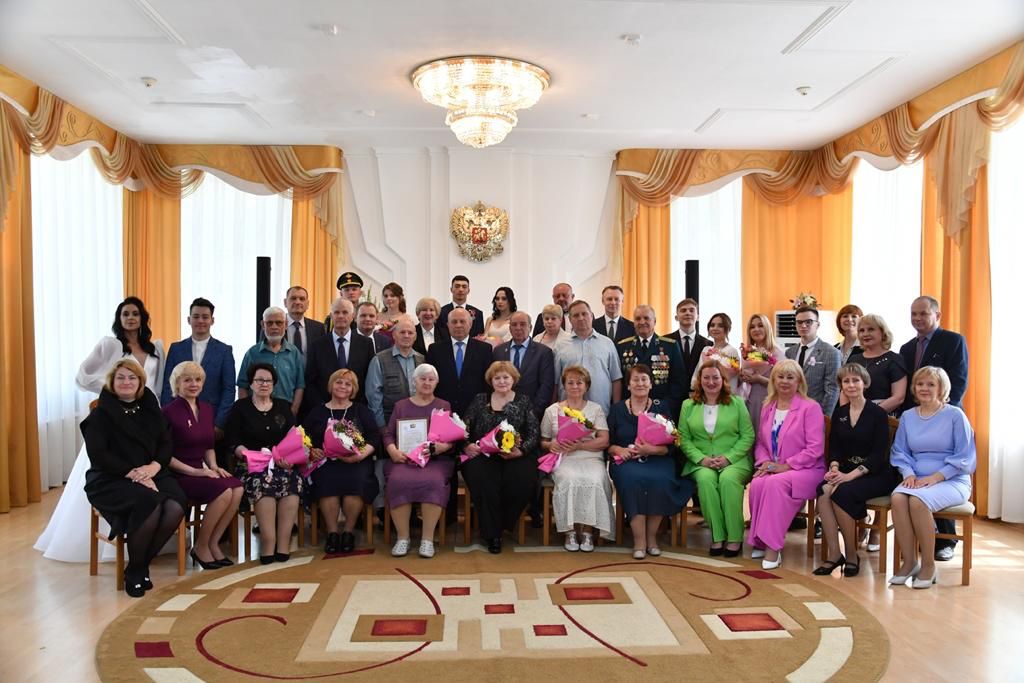 Помимо торжественного поздравления новобрачных, прожившие в браке более 50 лет, семейные пары получили памятные знаки «За супружеское долголетие».