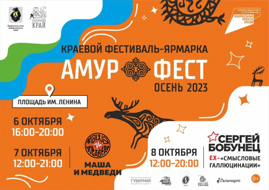 Также гости смогут посетить фотовыставку «Дальний Восток: вид изнутри», где можно ближе познакомиться с подземным миром Дальнего Востока и уникальными горными хребтами региона. В книжном квартале «Край замечательных людей» от Дальневосточной государственной научной библиотеки гостям фестиваля представят увлекательную программу, включающую книжную выставку о наших выдающихся земляках, викторину «Люби и знай свой край», мастер-классы по рисованию акварелью и прикладному творчеству, а ещё покажут документальные фильмы о таких выдающихся людях, как Г.И. Невельской, В.К. Арсеньев, А.П. Лепетухин, Н.Д. Наволочкин. В субботу, 7 октября, в 12:00 свою программу представят студенты Института культуры, а в 13:00 – вокальный ансамбль «Планета». Национальный блок творческих коллективов края проведут в 14:00 – на сцену выйдут: образцовый ансамбль национального танца «Силакта», заслуженный коллектив РФ, народный хореографический ансамбль «Сэнкурэ», образцовый ансамбль танца «Родничок» и молодежный ансамбль национального танца «Эрку». В 15:00 выступит фолк-группа «Пара-ра», а в 16:00 – вокальный ансамбль «Стиль» и народный коллектив края, ансамбль русской песни «Калинушка». С 17:30 на площади начнется караоке для всех желающих. Вокальная группа Образцового академического хора Детской музыкальной школы (г. Амурск) порадует зрителей в 18:00. В 18:40 на разогрев перед звездными исполнителями выйдет ансамбль песни и пляски Восточного округа войск нацгвардии России. А уже в 20:00 состоится долгожданный концерт группы «Маша и Медведи», который можно посмотреть в прямом эфире на портале « Культура. РФ «.