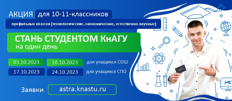 В октябре 2023 года в Комсомольском-на-Амуре государственном университете вновь стартует образовательная акция для старшеклассников 10-х и 11-х классов «Стань студентом КнАГУ на один день» . К участию приглашаются 10 и 11-классники профильных классов (технологических, экономических, естественно-научных) школ города Юности и обучающиеся учреждений среднего профессионального образования.
