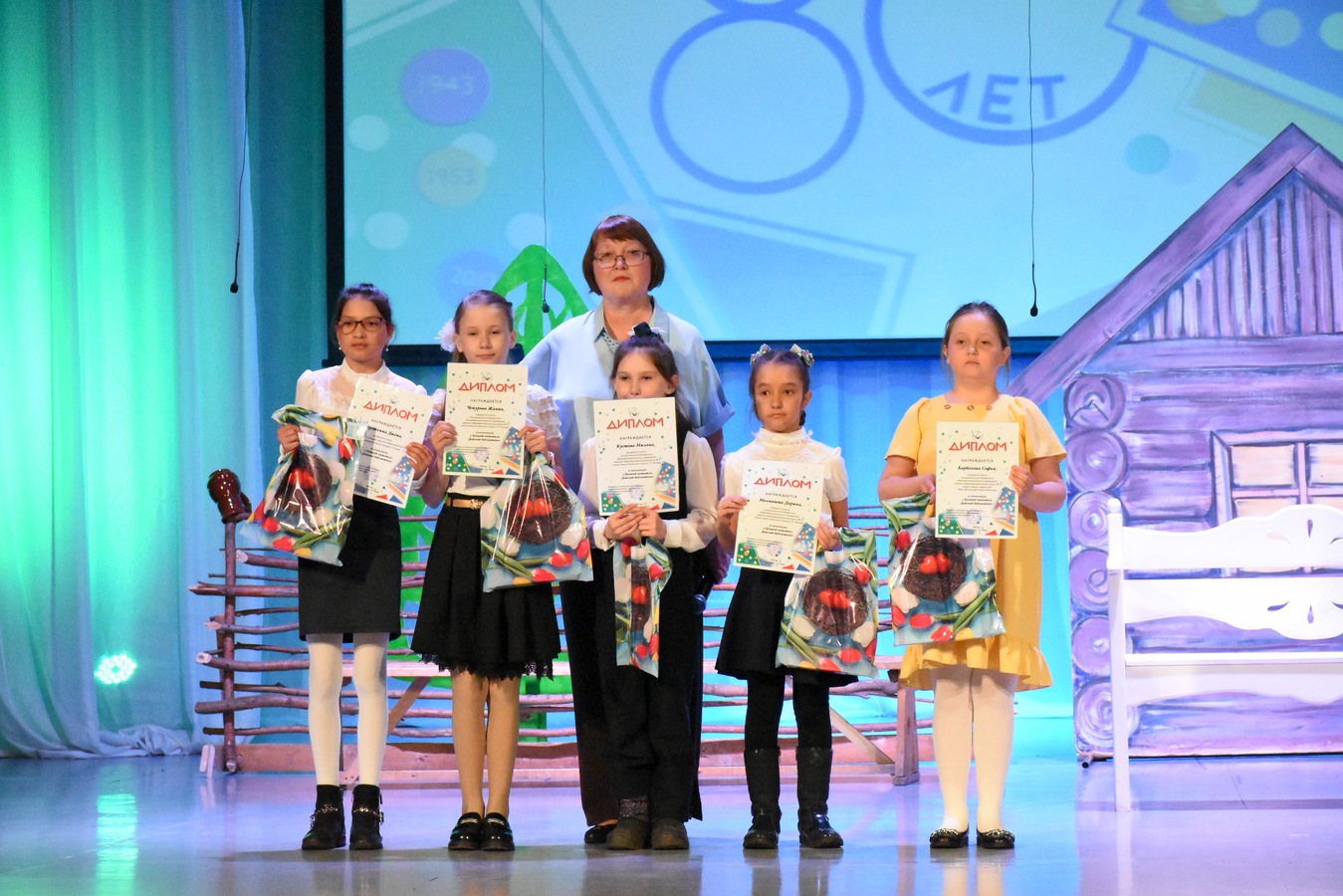 На большой праздник, посвященный Николаю Дмитриевичу Наволочкину заглянули и герои его чудесной книги «Полудница Акуля». Эта книга об удивительной бабушке - полуднице, которая жила в малиннике, в шалашике, себя называла ласковым именем Акуля и всё лето следила в огороде за порядком. В роли Акули – Софья Барбакова, в роли отличницы Лиды поочерёдно Алена и Оля Киреевы.
