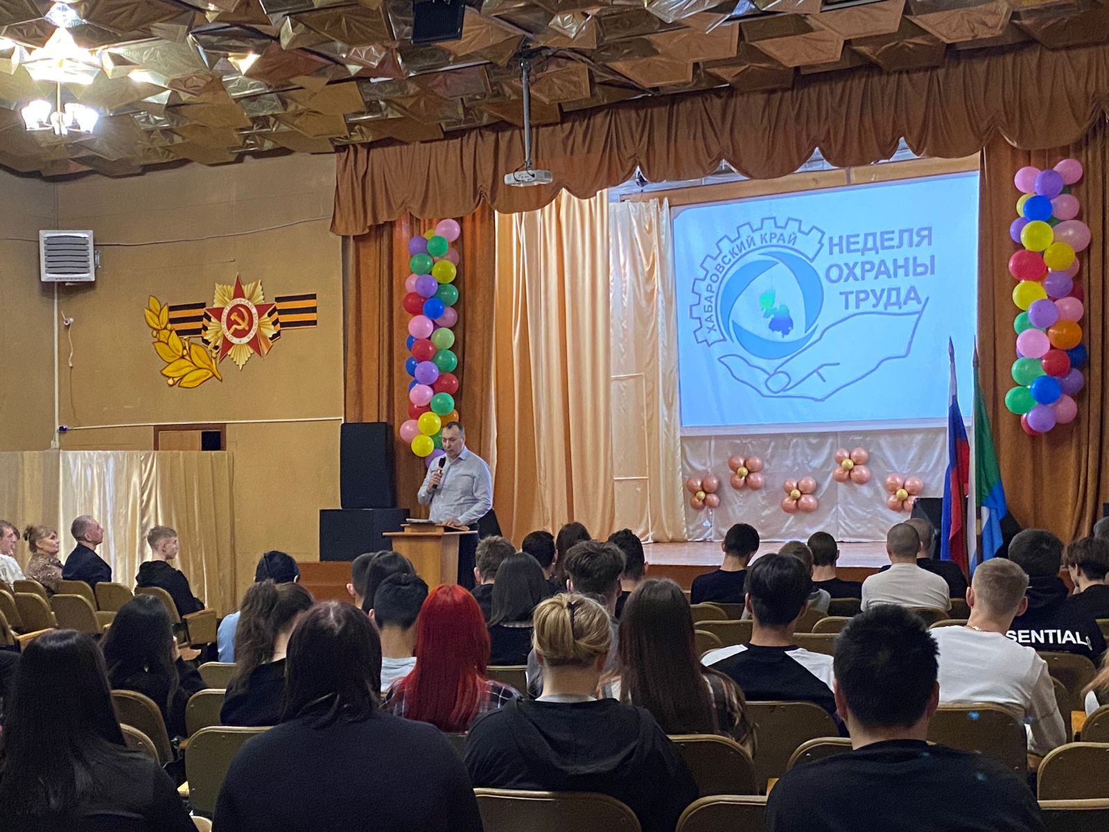 В раках Недели охраны труда, «Солнечный промышленной техникум» присоединился к краевой акции «Сохрани жизнь для своих детей». Для студентов бала проведена спортивная пятиминутка, и тематический квест по вопросам, касающимся безопасного труда и жизнедеятельности. Для работников и студентов была организована беседа на тему: «Безопасность работников эффективный способ повышения производительности труда!», а также состоялось торжественное поощрение работников, достигших лучших результатов в области охраны труда.