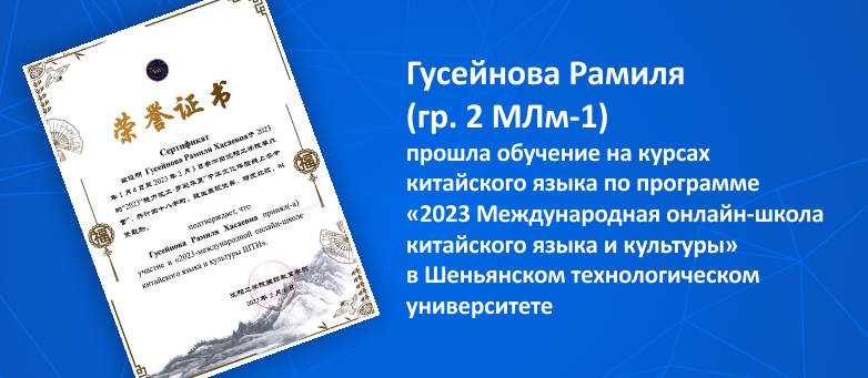 В период с 4 января по 3 февраля 2023 года студентка социально-гуманитарного факультета кафедры лингвистики и межкультурной коммуникации группы 2МЛм-1 Гусейнова Рамиля прошла обучение на курсах китайского языка по програ