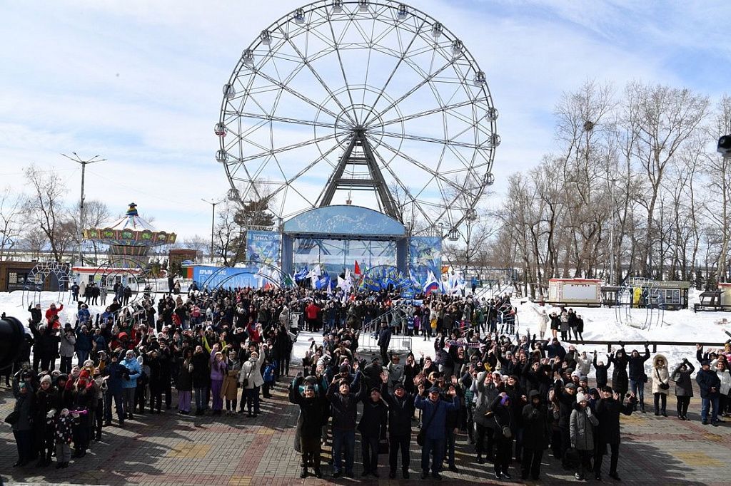 Мероприятие состоялось на набережной стадиона имени Ленина возле колеса обозрения.В нем приняли участие представители политических партий, региональных общественных, молодёжных и ветеранских организаций, музыкальные коллективы. На сцене выступил ансамбль народной песни «Берега России», Нанайский хореографический ансамбль «Сэукэн» и другие коллективы. Также гости мероприятия приняли участие во флэшмобе и выстроились в слово «Крым».