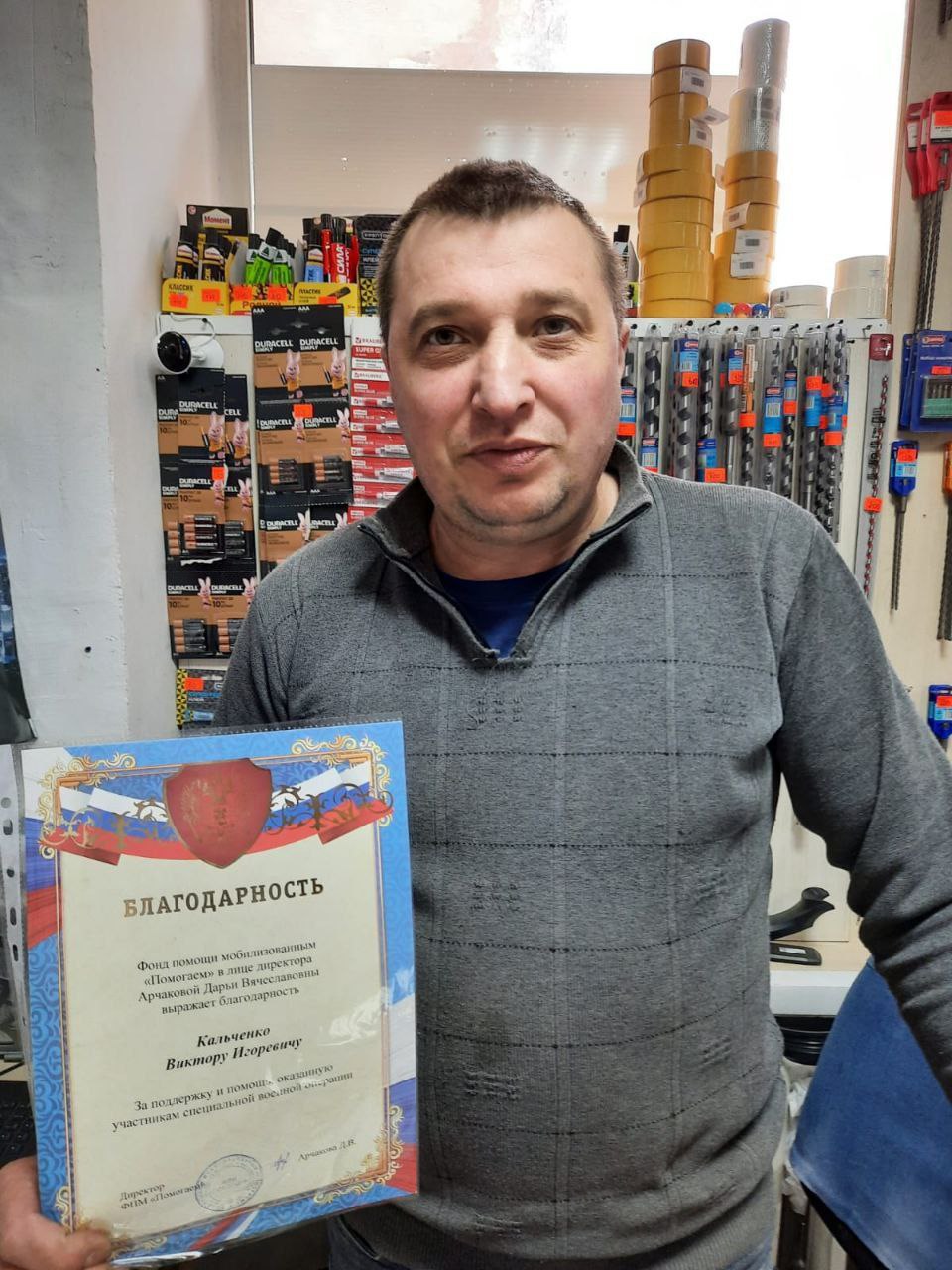 "Эта благодарность всем моим землякам, всем эльбанцам. Люди помогают кто чем может: приносят медикаменты, продукты питания, средства гигиены, тёплые вещи. Наш завод "Восход" помогает парафином, из которого эльбанцы делают свечи. У себя на работе я формирую посылки, упаковываю и увожу в Комсомольск-на-Амуре в приемный пункт сбора помощи мобилизованным" – рассказал Виктор Кальченко.