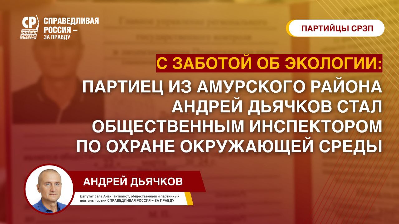 Помощник сенатора Сергея БЕЗДЕНЕЖНЫХ, депутат Собрания депутатов Амурского района от партии СПРАВЕДЛИВАЯ РОССИЯ – ЗА ПРАВДУ Андрей Дьячков стал общественным инспектором по охране окружающей среды.