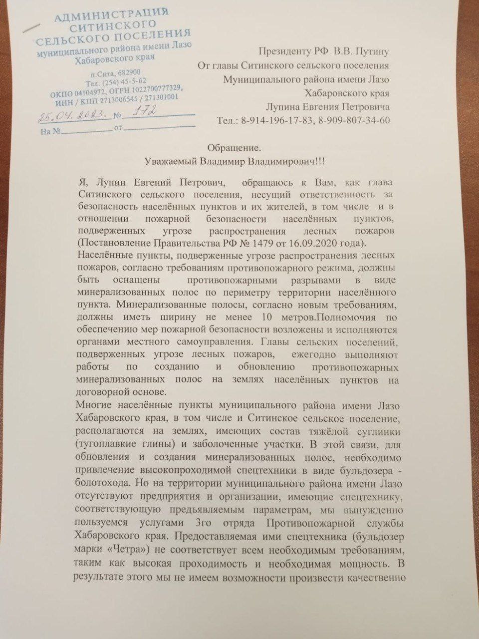 Глава Ситинского сельского поселения района им. Лазо, член партии СПРАВЕДЛИВАЯ РОССИЯ – За Правду Евгений Лупин обратился за помощью к Президенту России.