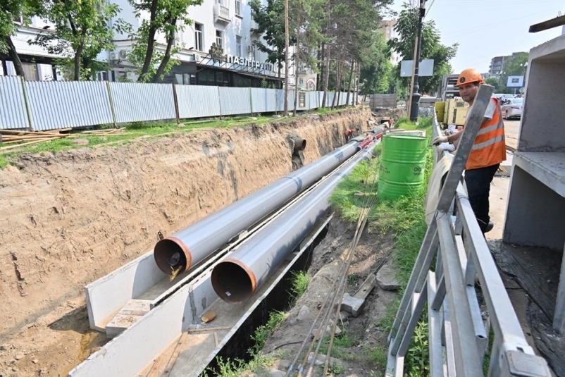 Работы выполняются по заказу СП «Хабаровские тепловые сети» АО «ДГК». Подрядчиком выступает ООО «Гарант Строй». Организация строго придерживается технологии замены труб.
