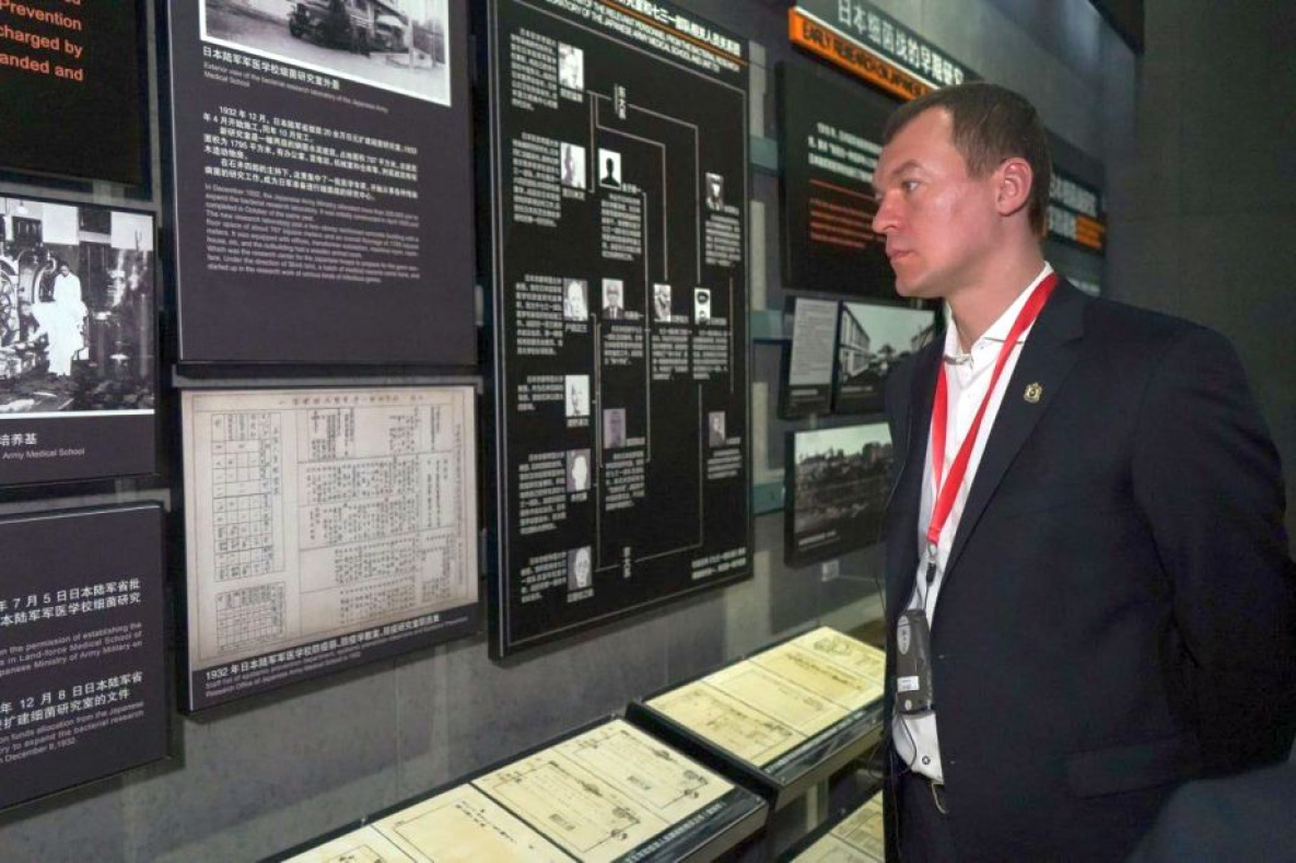 Во время визита в Харбин Дегтярев побывал в музейном комплексе «Отряда 731», где представлена экспозиция о подразделении вооруженных сил Японии, которое проводило эксперименты над людьми в области биологического оружия.