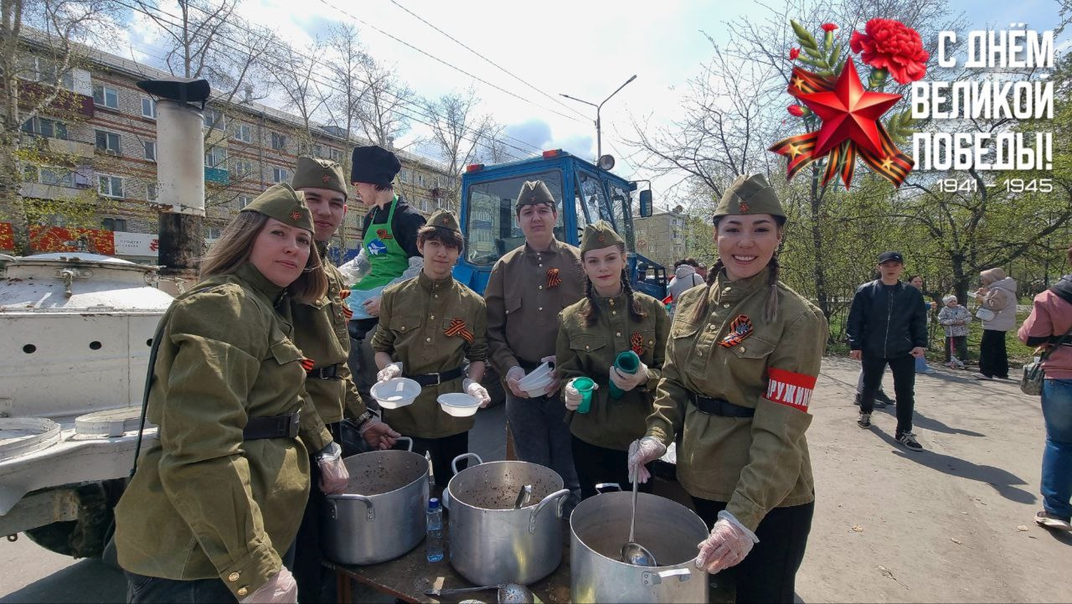 9 мая традиционно отделом экономики, отделом по молодёжной политике, физической культуры и спорту администрации города, Советом молодежи города, студентами Амурского политехнического техникума, а также волонтерами Волонтерского отряда «Мы вместе» СШ № 6 и волонтерами отряда «ИСК» СШ № 3 была организована Полевая кухня.