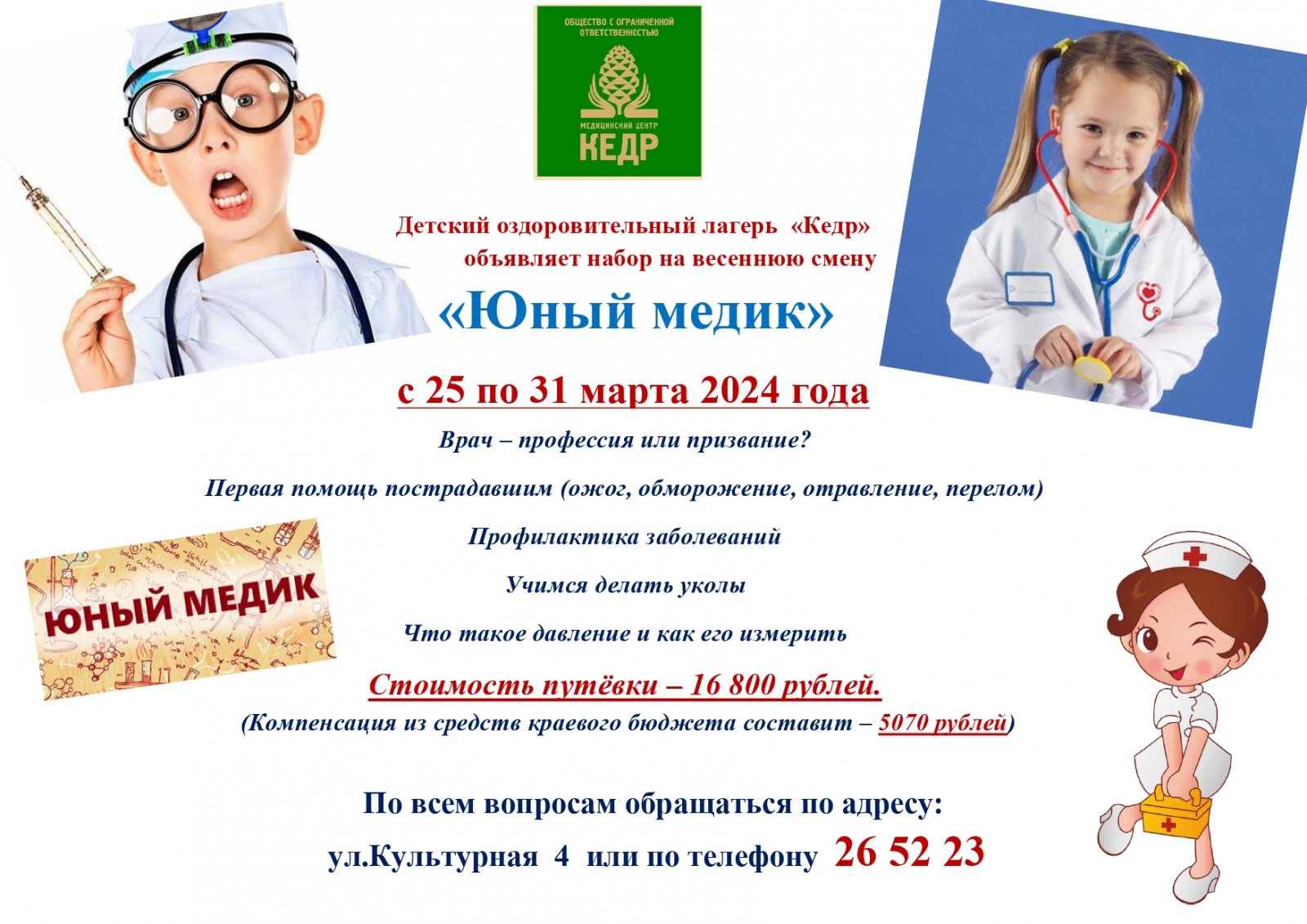 С 25 по 31 марта детский оздоровительный лагерь «Кедр» проводит весеннюю смену «Юный медик». Ребята узнают о первой помощи пострадавшим (ожог, обморожение, отравление, перелом), профилактике заболеваний, научатся делать уколы, измерить давление.