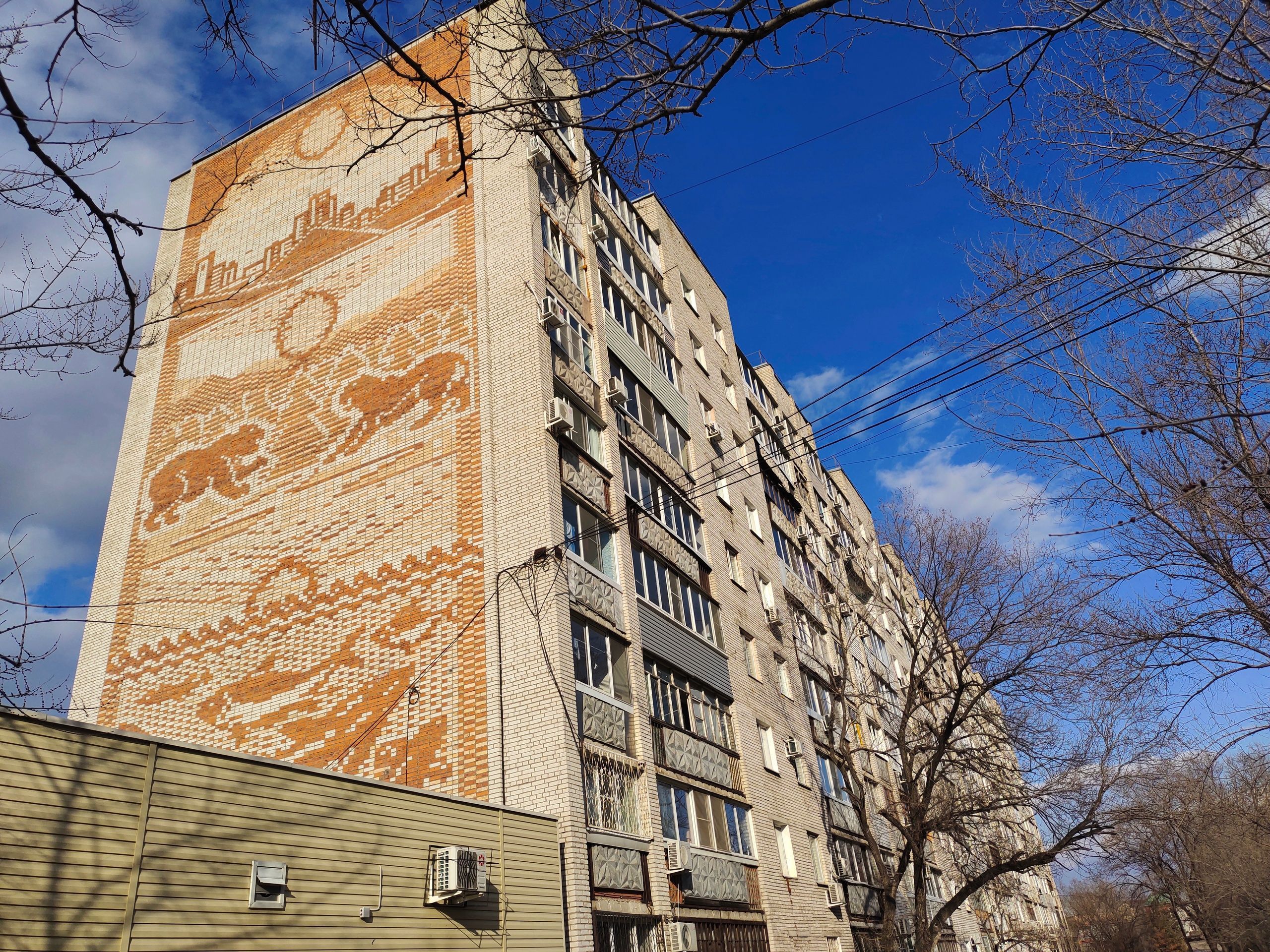 Хотя, конечно, не вся, а ее торцевая стена. Дело в том, что на ней вот уже больше 30 лет (с 1989 года) красуется одно из самых красивых кирпичных панно на Дальнем Востоке — а может, и во всей стране.