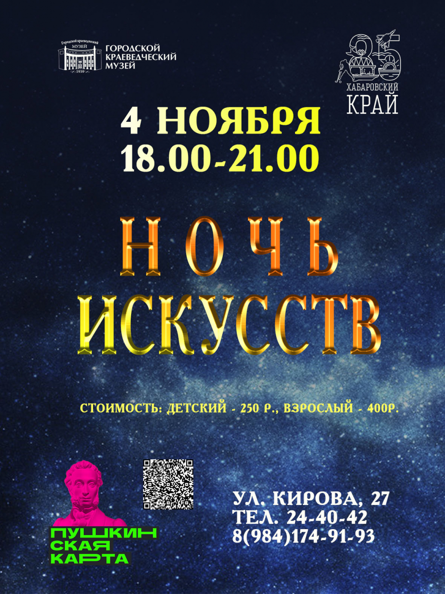 4 ноября с 18:00 до 21:00 краеведческий музей проведет всероссийскую акцию «Ночь искусств». В эту ночь гости познакомятся с многонациональной культурой и уникальной природой Хабаровского края, которому 20 октября исполняется 85 лет.