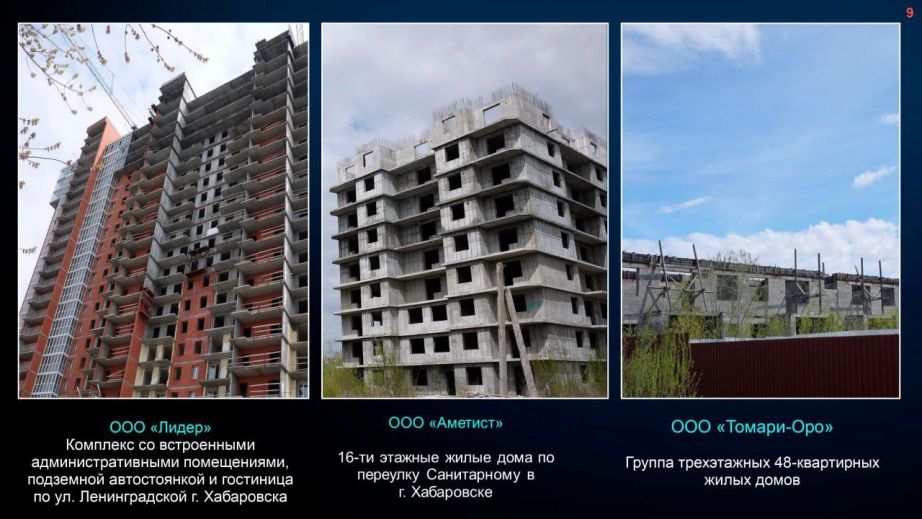 Что же касается недобросовестных застройщиков ООО «Томари-Оро», ООО «Аметист» и ООО «Лидер», то согласно расчетам Фонда, плановые затраты на завершение объектов составляют 1,78 млрд рублей. Из них вложения Фонда — 1,42 млрд руб. Для обеспечения софинансирования со стороны края зарезервированы бюджетные средства в размере 341 млн рублей.