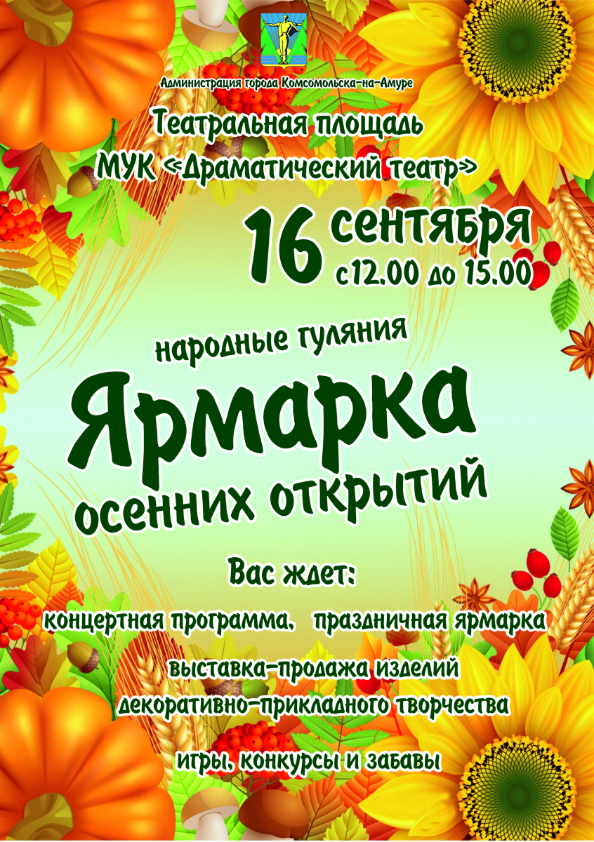 16 сентября с 12:00 до 15.00 на площади Драматического театра пройдет Ярмарка осенних открытий.