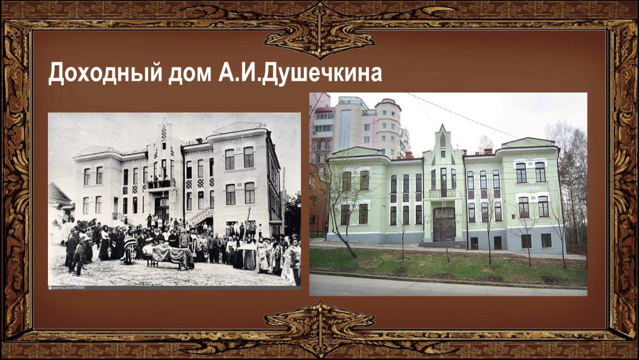 В телеграм-канале городской администрации говорится, что дом на Калинина, 27 — доходный дом семьи Душечкиных, построенный в начале XX века (по разным данным, в 1907 или 1912 году). Во времена царской России там располагался счётный отдел управления по постройке Амурской железной дороги, затем — Пушкинское училище, а впоследствии ещё несколько учебных заведений. Сейчас там работает центр бухучёта краевого Минобрнауки.