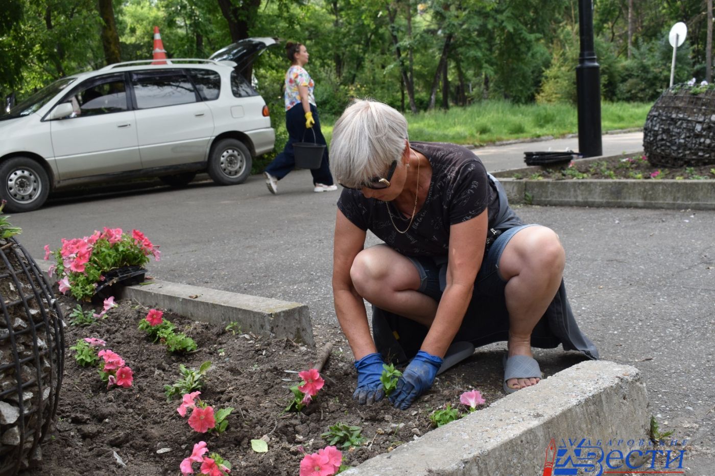 Чтобы городские клумбы выглядели достойно и украшали любимые места отдыха хабаровчан, работники муниципального предприятия с самого утра приехали на Амурский бульвар. Выгрузив рассаду, землю и весь нужный инвентарь, девочки, как птички разлетелись по разным участкам и принялись усаживать цветущие корешки петуний в цветники и вазоны. Людей не пугает даже то, что за такое правонарушение предусмотрено административное наказание и штраф.