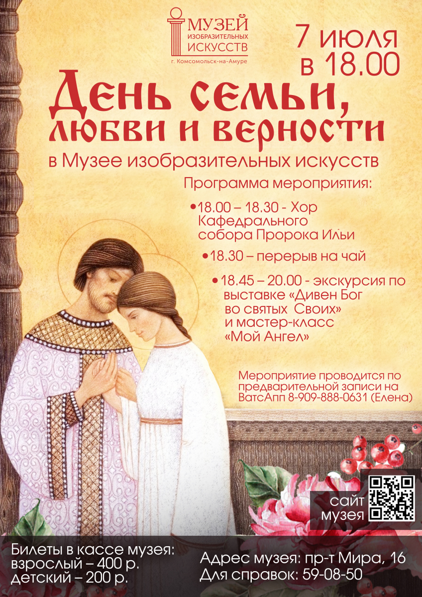 7 июля в 18.00 музей изобразительных искусств приглашает комсомольчан на вечернее мероприятие, посвящённое Дню любви, семьи и верности.