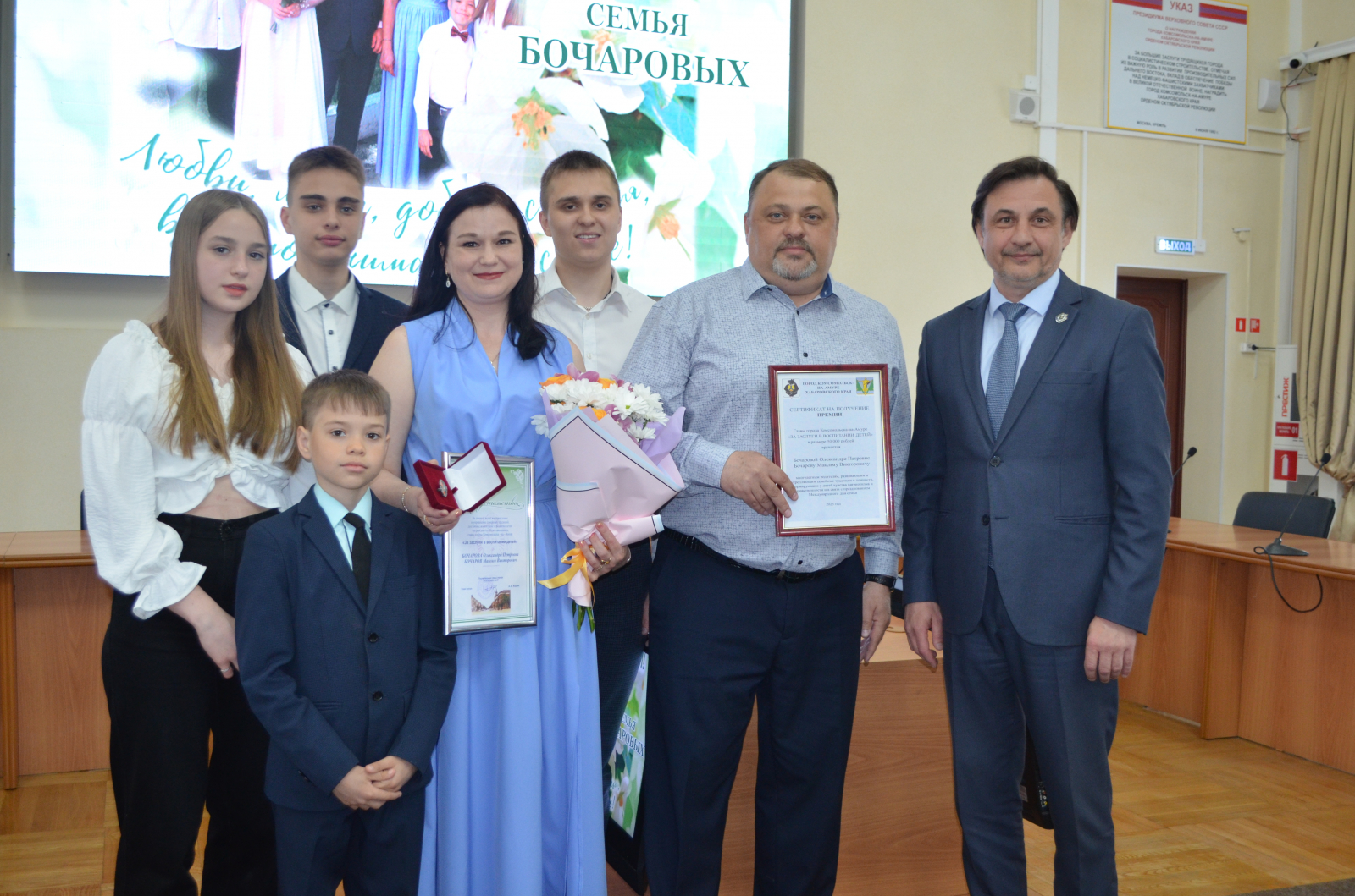 12 мая в Комсомольска-на-Амуре прошла торжественная церемония награждения почётным знаком главы города «За заслуги в воспитании детей». Градоначальник Александр Жорник вручил их трём многодетным семьям.