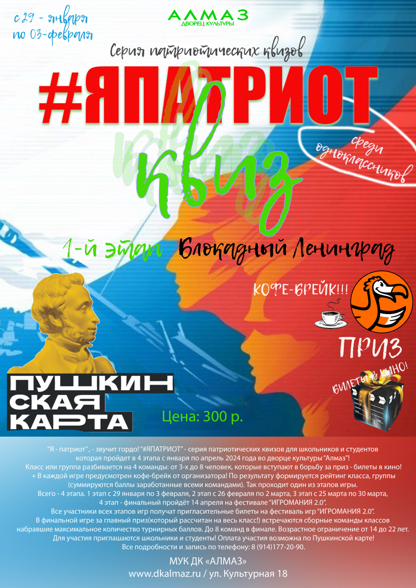 С января по апрель во Дворце культуры «Алмаз» проходит серия патриотических квизов для школьников и студентов «Я Патриот».