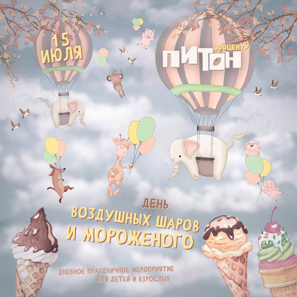 15 июля в 14:00 зоологический центр "Питон" приглашает горожан на "День воздушных шаров и мороженого».