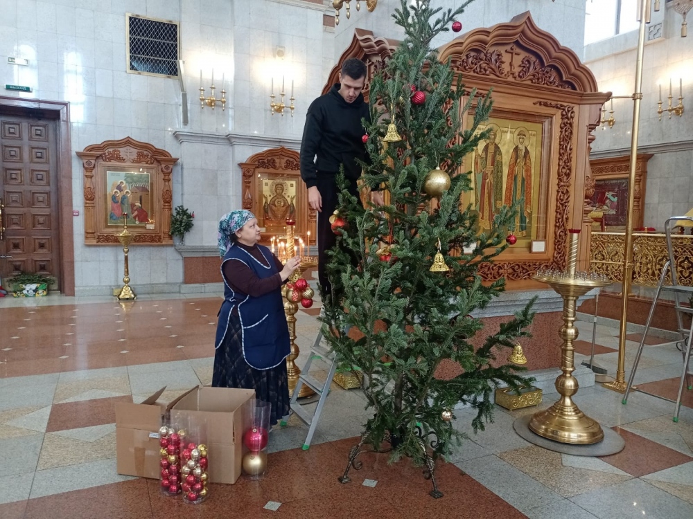 В Спасо-Преображенском кафедральном соборе сотрудницы и прихожане храма украсили еловыми ветвями иконостас и другие элементы храма, наряжают ёлки, установленные внутри.