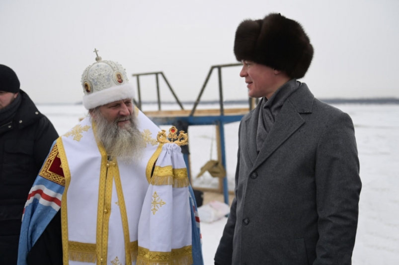 Сегодня, в праздник Крещения Господня, губернатор Михаил Дегтярев принял участие в церемонии Великого освящения воды на протоке Амурская, которое совершил митрополит Хабаровский и Приамурский Артемий, сообщили ИА AmurMedia в пресс-службе правительства Хабаровского края.