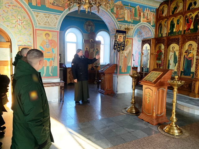 Военные вместе с отцом Стахием побывали в Спасо-Преображенском кафедральном соборе и в храме святого благоверного князя Александра Невского. Эти храмы были выбраны не случайно: величественный кафедральный собор является главным собором Хабаровского края, в нём хранятся мощевики с частицами святых, к которым люди часто обращаются в сложные времена. А история храма святого благоверного князя Александра Невского, который был открыт в городе во время Великой Отечественной войны, где люди молились о победе русского народа, не может оставить равнодушным никого. К святому покровителю храма Александру Невскому, который до принятия пострига был талантливым правителем и воином, глубоко верующим христианином, обращаются за помощью в военных победах и защите на поле брани.