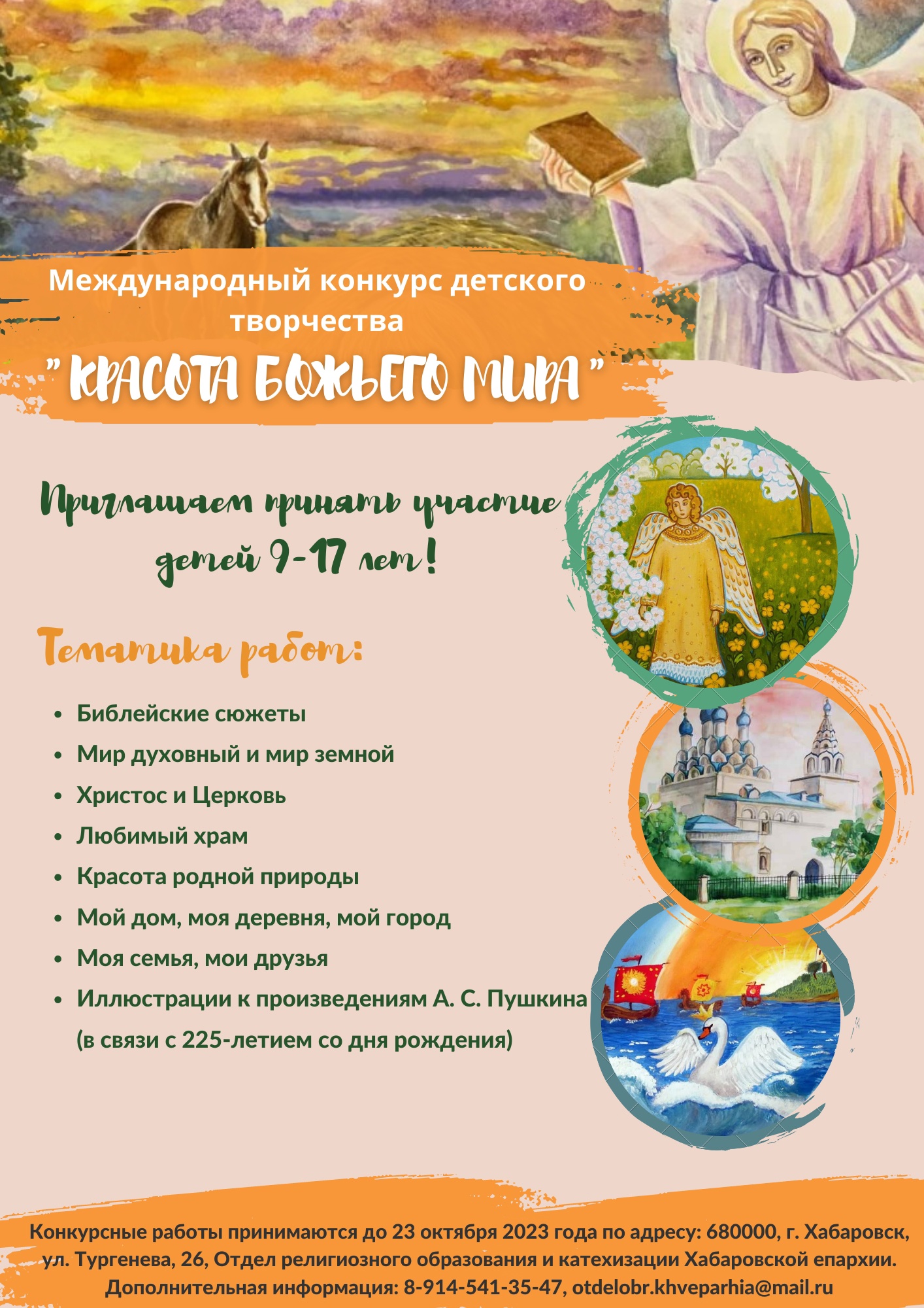 Конкурсные работы принимаются до 23 октября 2023 года лично или почтой по адресу: 680000, г. Хабаровск, ул. Тургенева д. 26, Отдел религиозного образования и катехизации (тел. для справок: 8-901-466-03-01, 8-914-541-35-47; e-mail: [email protected]).