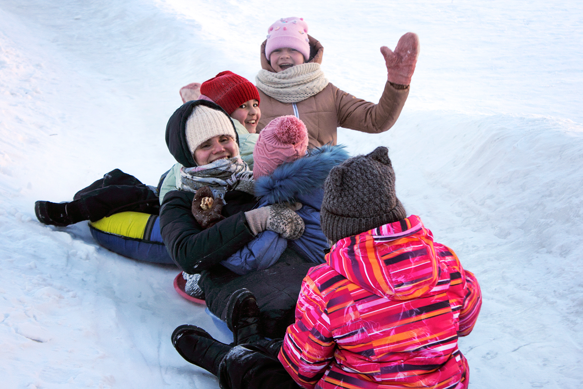 Вооруженные ледянками, коньками и клюшками отдыхающие, приехавшие на двух автобусах, сразу атаковали ледяную горку. Дети, оседлав ледянки, тут же стали осваивать спуск с горки, не отставали и взрослые. Со смехом и восторженным визгом, крепко держась друг за друга, летели по ледяной горке целые «паровозики» из детей и взрослых.