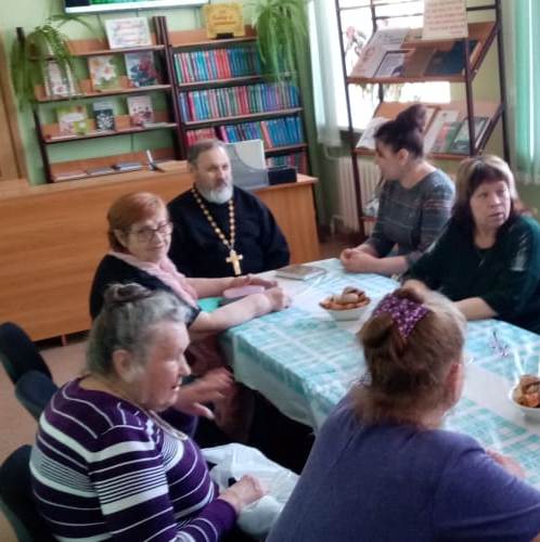 7 апреля в Городской библиотеке города Вяземский настоятель Никольского храма протоиерей Андрей Колобов провел беседу с членами женских православных клубов «Вдохновение» и «Хозяюшка» на тему «Библейские сюжеты о Пасхе Христовой».