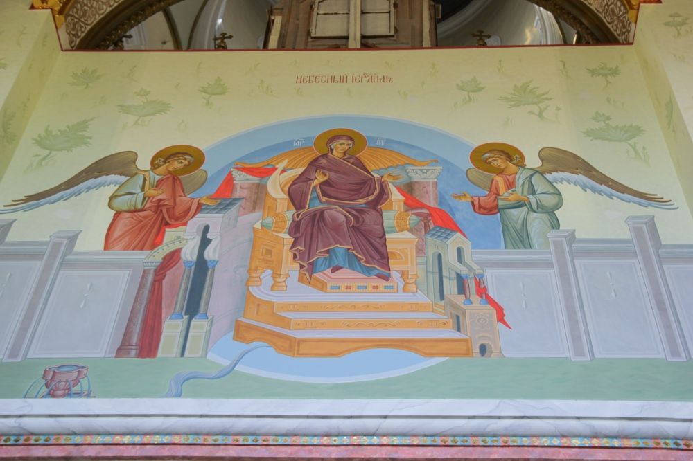 Вся роспись сделана в пастельной гамме. Иконописцы таким образом подчеркнули архитектурное величие храма, его воздушность и торжественность.