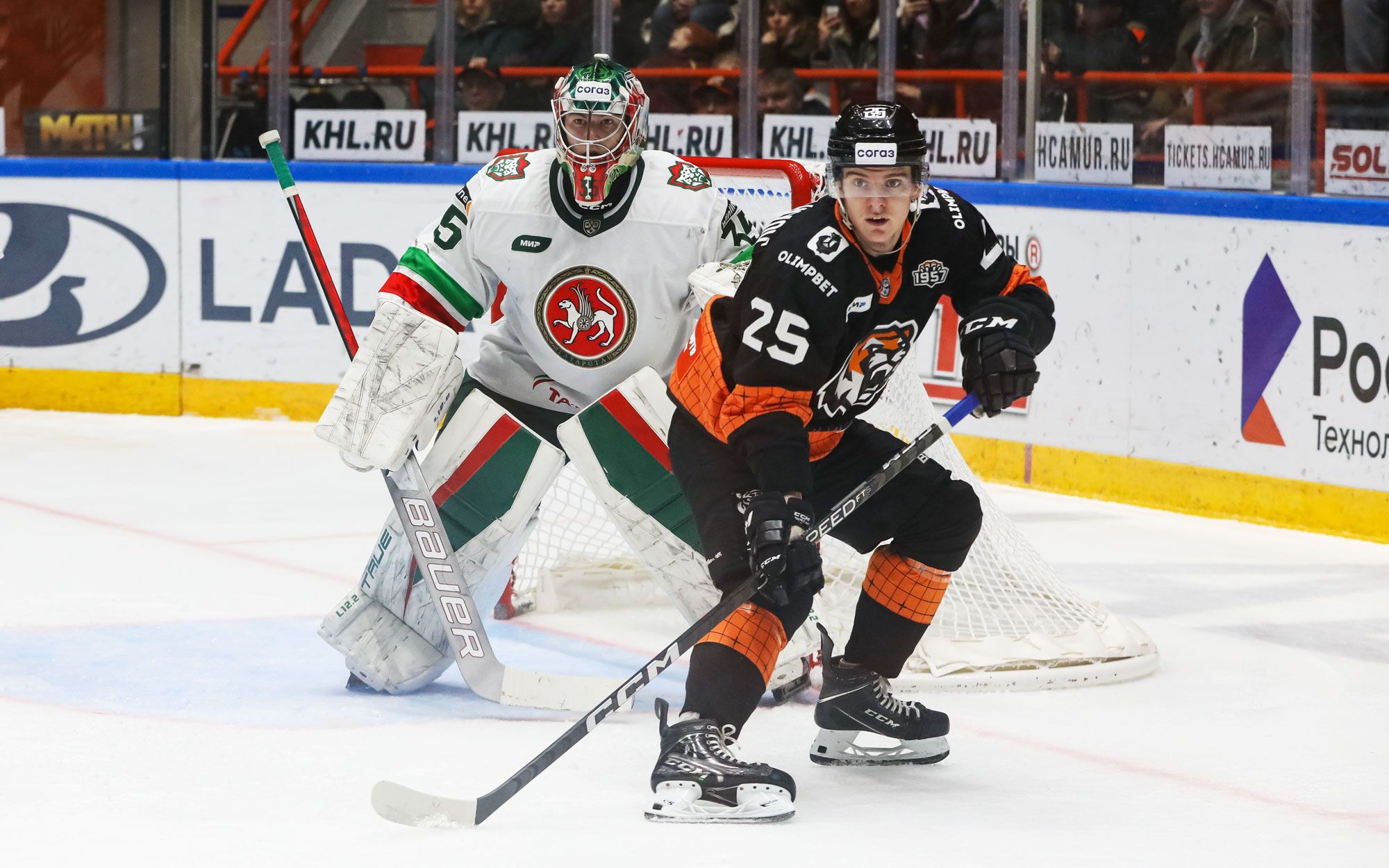 Первая игра соперников началась неудачно для хабаровчан. Уже на 27-й минуте встречи казанцы вели в счете 3:0. Правда, до ухода на второй перерыв «тигры» постарались и отквитали две шайбы. По голу записали на свой счет Ян Дрозг и Станислав Бочаров. Увы, но начать третий период с минимальным отрывом у хабаровчан не вышло — «Ак Барс» всего за минуту до перерыва сделал счет 4:2. Вячеслав Грецкий сократил в заключительном отрезке отставание на одну шайбу, но на большее «Амур» не хватило — 3:4.