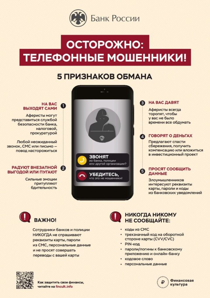 Специально для повышения финансовой грамотности населения Банк России в Хабаровском крае подготовил информационные карточки и социальные видеоролики, помогающие повысить киберграмотность и распознать телефонных и интернет-мошенников.